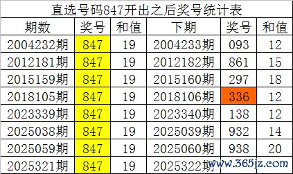 从以上统计不错看出,直选号码847出现之后,其下期奖号:1.下期全奇全偶组合莫得出现;2.下期全大全小组合莫得出现;3.下期0路号码出现概率100%;4.下期全质全合组合莫得出现;